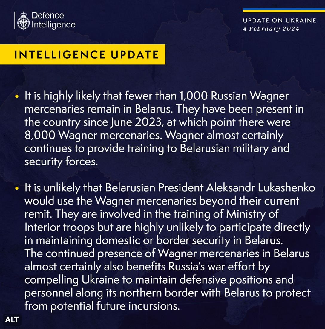 - Briti luureraport. Wagnerlasi on Valgevenes olnud 2023. aasta juunist, tol ajal oli palgasõdureid 8000. Peaaegu kindlasti jätkab Wagneri rühmitus Valgevene sõjaväe- ja julgeolekujõudude väljaõpet, märkis Briti kaitseministeerium. Palgasõdurite jätkuv kohalolek Valgevenes tuleb peaaegu kindlasti kasuks ka Venemaa sõjalistele jõupingutustele, sundides Ukrainat säilitama kaitsepositsioonid ja isikkoosseisu piki Valgevene põhjapiiri.