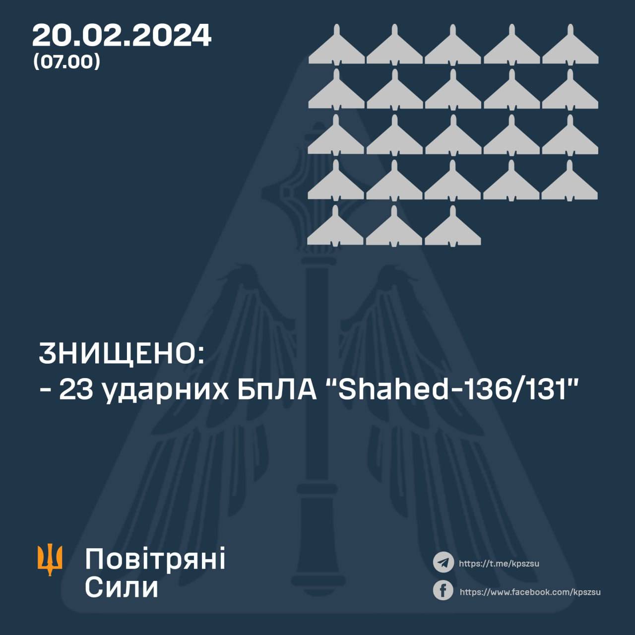 Öösel vastu 20. veebruari öösel ründas vaenlane kahe juhitava õhutõrjeraketiga S-300/S-400 (Belgorodi piirkond), juhitava raketi Kh-31 (Zaporiži oblast) ja 23 Shahed-tüüpi drooniga ( Primorsko-Ahtarsk – Venemaa Föderatsioon). Õhutõrjeüksused hävitasid Harkivi, Poltava, Kirovohradi, Dnipropetrovski, Zaporižžja, Hersoni ja Mõkolaivi oblastis alla kõik 23 “šahedit”.