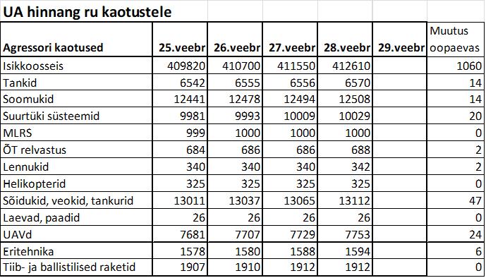See, et Ukraina poolsetes vene kaotuste hinnangus jäävad näpukad parandamata näitab, et tegemist on numbritega millel pole sisu. Konkreetselt suurtükid teist päeva.