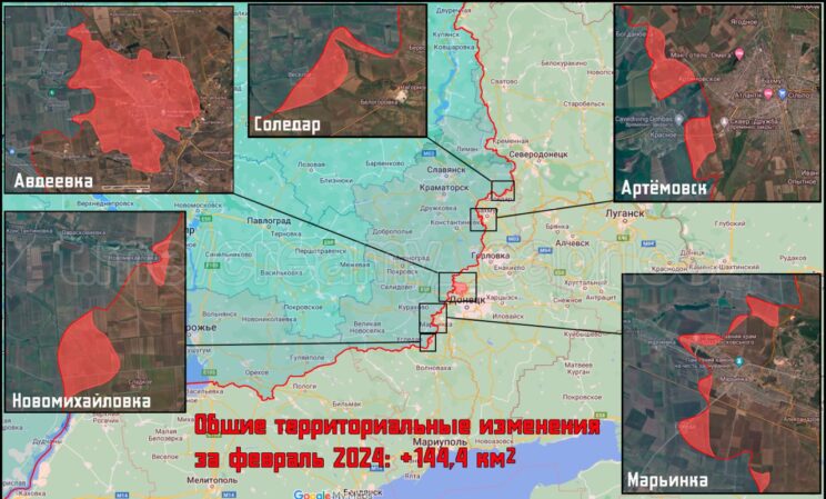 2024. aasta veebruari lõpu seisuga okupeerib Venemaa Ukrainast 17,51% (+0,02%). See on 137,95 km² suurem Venemaa edu alates jaanuari lõpust ja mis on Venemaa suurim edu alates 2023. aasta jaanuarist.