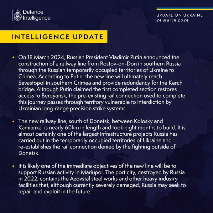 • Briti luureraport:  Venemaa ehitab Berdjanskisse raudteed, kuid see on kaudtule rünnakute suhtes haavatav. Venemaa soovib ühendada Doni-äärse Rostovi ja Krimmi raudtee abil. Raudtee esimene lõik taastab väidetavalt juurdepääsu Berdjanskile. Briti luure juhib aga tähelepanu sellele, et olemasolev raudtee läbib piirkonda, mis on haavatav Ukraina pikamaa täppislöögisüsteemide suhtes. Samuti usub luure, et Vene Föderatsiooni üks eesmärke saab olema Mariupoli tegevuse toetamine. Briti kaitseministeerium teatas, et tõenäoliselt tahavad venelased taastada Azovstali ja muud rajatised, mille nad 2022. aastal hävitasid.