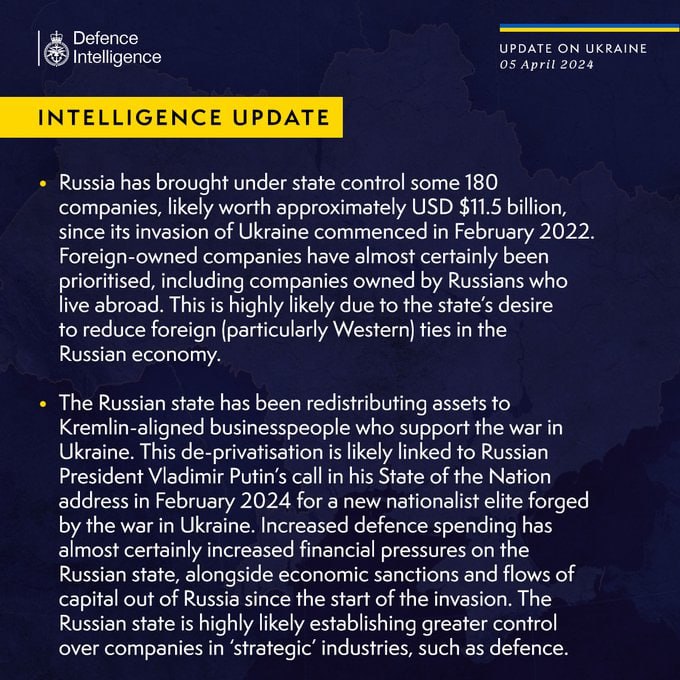 • Briti luureraport: Putin jagab valitud ettevõtteid Kremli-meelsetele ärimeestele. Venemaa on alates Ukraina sissetungi algusest 2022. aasta veebruaris võtnud riigi kontrolli alla umbes 180 ettevõtet umbes 11,5 miljardi dollari väärtuses. Briti luure andmetel jagab Vene riik varasid ümber Kremli-meelsetele ärimeestele, kes toetavad sõda Ukraina vastu. Nii loob Putin Ukraina-sõja toetajatest uut “eliidi”.