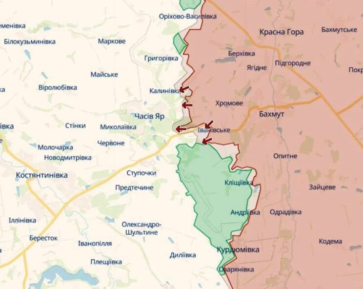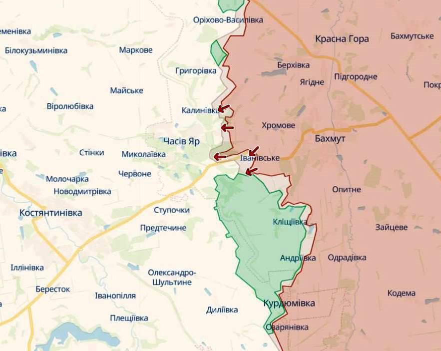 Olukord on täielikult kontrolli all, Chasovoy Yaris pole okupante. Vene rünnakrühmad liiguvad jalaväe lahingumasinatel, ründavad nii droonide kui ka suurtükiväe toel. Vaenlasel ei ole seal mingit kasu. Ja kui vaadata meie kaitseliine üldiselt, siis seal, kus on võimalus, tugevdame neid. Pealegi tugevdame pidevalt ja üsna oluliselt,» ütles 26. suurtükiväe pressiesindaja Oleg Kalašnikov. “Lahingud Tšasovoi Jari äärelinnas juba käivad,” ütles rahvuskaardi “Rubizh” brigaadi ohvitser Volodymyr Chernyak. Okupantidel õnnestus Bohdanivkas jalad maha saada, nii et viimane eelpost Ivanovskis jääb alles. Lisaks on linna ees veekanal, mida russistid pole veel jõudnud ületada.
