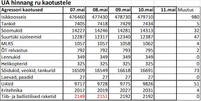 Ukraina hävitas 10 ründe UAV-d ööl vastu 10. Maid. Krimmi territooriumilt rünnati 10 “Shahed-131/136” ja Belgorodi oblastist kahe raketiga S-300/S-400.