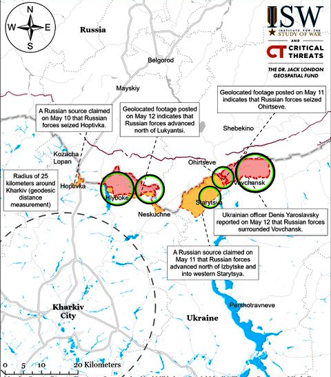 ISW: Vene väed tegid hiljuti 12. mail kinnitatud edasitungi Lytpsi (Harkivi linnast põhja pool) suunas. 12. mail avaldatud geograafilised kaadrid näitavad, et Vene väed tungisid Pylnast lõunas ja Lukjansist põhja pool (Lyptsi kirdes) asuva tuuletõkkeni. . Vene ja Ukraina allikad teatasid lahingutest Lyptsi suunas Hlyboke’i (Lyptsi põhja pool) ja Lukjantsi lähedal.