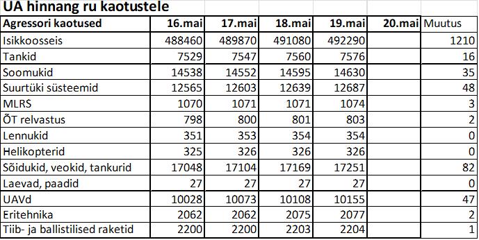 • Kindralstaabi Operatiivinfo seisuga 23.00 18.05.2024.Olukord rindel on jätkuvalt pingeline. Ukraina kaitsjad annavad pausi Vene okupantide survele, tugevdavad meie kaitset ja soodsatel tingimustel vasturünnakule.Harkivi suunas toimus 12 lahingukokkupõrget. Meie sõdurid tõrjusid kuus rünnakut Harkivi oblasti Glyboke’i ja Lukjantsi asulaid lõuna pool. Vaenlane jätkab katseid läbi murda Ukraina üksuste kaitsest Zelene asula suunas, ei loobu katsetest Vovtšanski vallutada. Vene okupandid kasutavad õhurünnakuteks lennundust: ööpäeva jooksul kaks juhitavat õhupommi Harkivis, viis CAB-d Veselomis ja neli Liptsi piirkonnas. Kaitsejõud üritavad vaenlast välja tõrjuda Süva asula suunas ja Vovtšanski piirkonnas. Vastase ööpäevased kaotused on kokku 125 inimest. Vaenlane kaotas ka 31 ühikut relvastust ja sõjatehnikat, sealhulgas kolm tanki, kuus kahurit ja miinipildujat. Lisaks on mõjutatud 15 vaenlase peidupaika. Info on täpsustamisel.Kupânski suunas kasvas lahingkokkupõrgete arv päevas 11-ni. Kaitsejõud tõrjusid edukalt vaenlase rünnakud Synkivka, Ivanivka, Brestove asulate aladel.Limansiki suunal pole olulisi muutusi olukord kogenud. Vaenlane sooritas kuus ebaõnnestunud rünnakut Novosadove, Torske ja Grigorívka asulate suundadel.Kramatorski suunas püüdis vaenlane 15 korda meie vägede kaitsest läbi murda. Asulate suunad Kalinivka, Klišchiyivka, Andriyivka ja Kurdyumivka ei õnnestunud, said kaotuse ja lahkusid. Lahingud jätkuvad Novy ja Ivanivskke Donetski oblasti asulate piirkonnas. Olukord on kontrolli all.