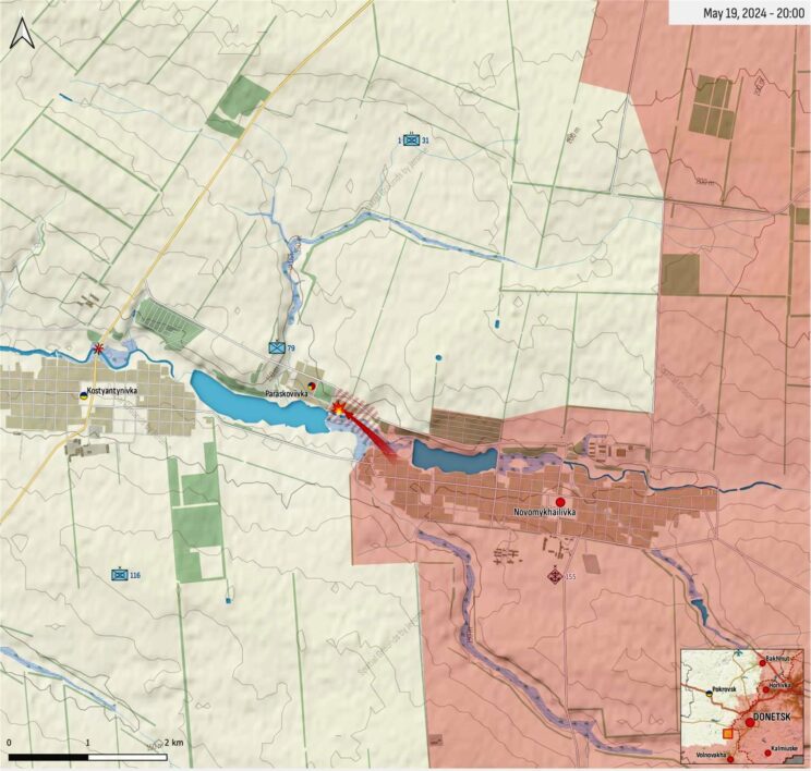 Vene väed jõudsid hiljuti veidi edasi Vovtšanskis ning Chasiv Jari ja Donetski linna lähedal. Vaenlane tungis Robotõnõst kagusse ja lõunasse, Verbovoy lähedal, Paraskoviivkas, Netaylovos, Jasnobrodivka, Novopokrovski, Keramiki, Berestovoi, Zelenõ ja Bugruvatka lähedal.