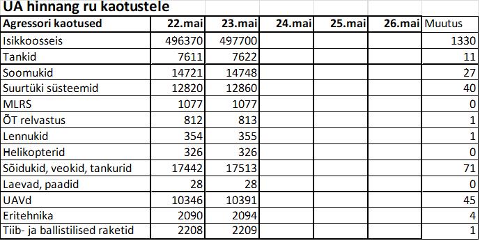- Andrii Drozda @AnDrozda vaatas üle 22. mai seisuga sõjategevuse kaardi, näitas viimaseid muudatusi rindel ning rääkis ka päeva põhiuudistest. Eelkõige analüüsis saatejuht olukorda Harkivi oblastis, kus venelased on viimastel päevadel aktiivselt edasi liikunud. Lisaks kommenteeris ta relvajõudude olukorda Donbasis ja lõunarindel. Vaata täpsemalt videost.