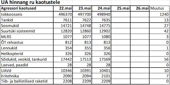 - USA valmistab Ukrainale ette uut 275 miljoni dollari suurust abipaketti. Kahe ametniku sõnul sisaldab pakett HIMARS-süsteeme, 155 mm ja 105 mm suurtükimürske. Muid üksikasju ametnikud ei avaldanud. Tulevane abipakett on neljas pärast seda, kui USA Kongress võttis aprilli lõpus vastu Ukrainale antava abi eelnõu.