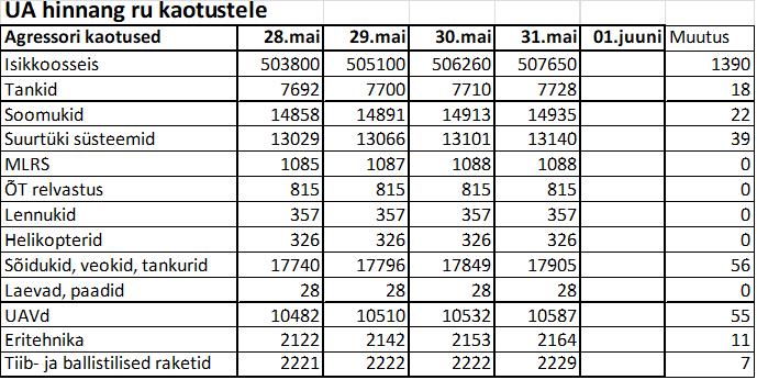 - 827 päeva on Ukraina sõjavägi rindel Vene sissetungijaid tagasi hoidnud, takistades nende edasiliikumist. Ukraina relvajõudude peastaabi teatel toimusid seekord ägedaimad lahingud Pokrovski suunal. Kokku registreeriti päeva jooksul 116 lahingukokkupõrget. Vaenlane andis 5 raketirünnakut, 58 õhulööki ja 127 mürsku, kasutades rakettsalvesüsteeme Ukraina vägede positsioonidele ja asustatud aladele. Harkivi suunal jätkavad okupandid pealetungitegevust. Kokku toimus eelmisel päeval 9 lahingukokkupõrget, lahingud toimusid Liptsi, Staritsa, Vovtšanski asulate aladel. Vahepeal tegi vaenlane Lymani suunas 9 katset läbi murda Ukraina vägede kaitsest Terni piirkonnas, Torski, Donetski oblastis ja Serebryani metsas. Täpsem ülevaade lahingukaardist 30. mai seisuga – vaata videost.