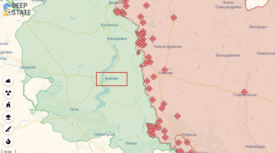 • Vaenlane lõi Borova ründamiseks šokirusika. Lõigus Raigorodkast Novovodyanyini on ikupantive arv kasvanud 10 000 võrra ja umbes 450 õhutõrjekahurini, millest 200 on suurtükiväesüsteemid. Eesmärk on ilmne — katse korrata eelmise aasta rünnakut Borova vastu. Vaenlase vastu suunatud pikka kaitseliini hoiavad hetkel 3 OSHBr. Kuid jõud on endiselt ebaproportsionaalne, okupandid on arvulises suuruses, kasutavad lisaüksusi ja korraldavad intensiivseid rünnakuid kogu ründeliini ulatuses. Agressor paigutas 20. armee väed 3 ja 144 diviisi kujul, mis on esindatud 236 suurtükiväebrigaadi ja 11 rügemendiga: 7 mootorpüssi, 2 tanki ja 2 suurtükki. Lisaks värvati palgasõdureid ebaregulaarsetest armeeüksustest. Nende hulgas on teada “storm v”, “must mamba”, “fixics” ja “chvk patriot” olemasolu. Üksus BARS-14 saabus korda hoidma. Viimased kolm nädalat on vaenlane viinud läbi ettevalmistavaid meetmeid kaitseväe nõrkade kohtade väljaselgitamise näol. Pidevalt rünnatakse 3 eraldiseisva ründebrigaadi positsioonidele. Vaenlane kaotab isikkoosseisu, kuid igal nädalal saabub 2–4 sada värskelt mobiliseeritud sõdurit. Sellest piisab nii rühma täiendamiseks kui ka laiendamiseks. Seni pole “liharünnakute” taktika märkimisväärseid tulemusi andnud ainult tänu sellele, et piirkonnas on tugev brigaad. Kuid me rõhutame, et jõud pole kaugeltki võrdsed. Olemasoleva teabe kohaselt plaanib vaenlane korrata eelmise aasta strateegiat väljumisega esmalt Nadija-Novojehorivka liinile ja seejärel Peršotravneve-Tšerneštšõnale. Antud olukorrast lähtuvalt on oluline mitte korrata eelmise aasta vigu, kuna Katsapide väejuhtimise tase on mõnevõrra tõusnud. Muret tekitab ka märkimisväärne arv palgasõdureid, keda kasutatakse peamiselt rünnakuks, mitte kaitsetegevuseks. Eelmisel aastal päästsid rinde ebaõnnestumisest vaid 68 OEBr-i täiendused pataljoniga 95 ODSHBr ja 23 OMBr.
