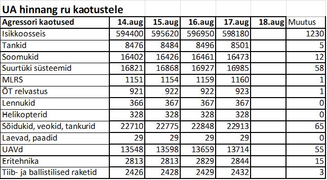 - OSINT analüütikud lugesid kokku Kurski operatsiooni tehnika kaotused ja avaldasid paari päeva eest, et kuni 13. augustini (k.a.) loetleti kokku venelastel 22 ja ukrainlastel 29 ühikut kaotatud tehnikat. Vene allikas väidab nüüd, et Ukraina relvajõud kaotasid pealetungi käigus ehk 11 päevaga 50 ühikut tehnikat. Viimase nädala jooksul kaotas Vene armee ainult kontrollitud fotode ja videote põhjal 51 ühikut varustust.