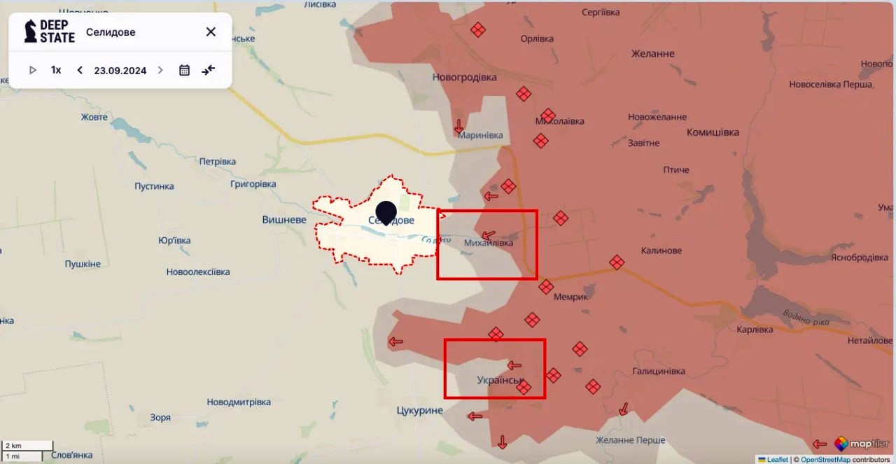- Vene väed on tõenäoliselt vallutanud enamiku, kui mitte kogu Hostre, ja vallutanud Selydove paranduskoloonia. Pärast Lääne-Krasnohorivka mehhaniseeritud rünnakuid jätkas Vene jalavägi tõenäoliselt Hostres edasitungimist, vallutades suurema osa asulast. Ukraina väed võivad endiselt säilitada positsioone kõige läänepoolsemates majades, kuid kui see on tõsi, tähendab see, et venelased läksid neist mööda ja tungisid Selydove paranduskolooniasse. Väidetavalt puhkesid piirkonda kaitsvate Ukraina vägede vahel kokkupõrked, kuid kuna venelased liikusid allamäge ja omasid arvulist ülekaalu, olid Ukraina väed tõenäoliselt sunnitud taanduma läände. Kui venelased liiguvad edasi läände, võimaldab see neil tulistada teed O0510, mis varustab Ukraina formatsioone Kesk- ja Lääne-Maksõmiljanivkas. Kui Ukraina sellest linnast taandub, langeb rindejoon tõenäoliselt Kurakhove suunas tagasi.