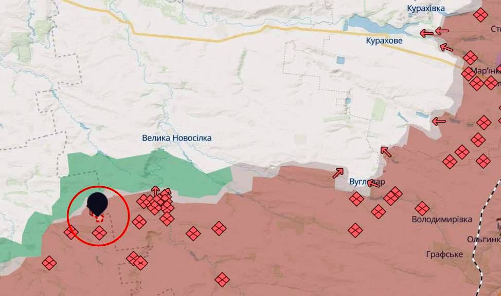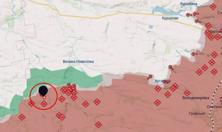 • Geolokeeritud kaadrid näitavad, et Vene väed tegid Myrnohradi suunas märkimisväärse edasimineku. Pärast positsioonide kindlustamist ja Ukraina rinde tähtsuse järjekorda seadmist näivad Vene väed alustanud Myrnohradi linna suunal järjekordseid pealetungioperatsioone. Selle tulemusel suutsid nad vallutada Krutyi Jari ja Krasnõi Jari külad, enne kui jõudsid edasi ja hõivasid positsioonid Mõkolaivka küla idaosas. Toetudes oma hoogu, selle asemel, et püüda vallutada ülejäänud Mykolaivka (kuigi on võimalik, et nad löödi tagasi), tungisid Vene väed kahe suure kaevikukindlustuse juurde Promini külast kagus, vallutades mõlemad. See tähendab nüüd, et Myrnohradi ees on murtud viimane kaitseliin ja lähiajal võivad alata otserünnakud linnale.