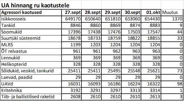 Operatiiv- ja sõjaga seotud info 01. oktoobril