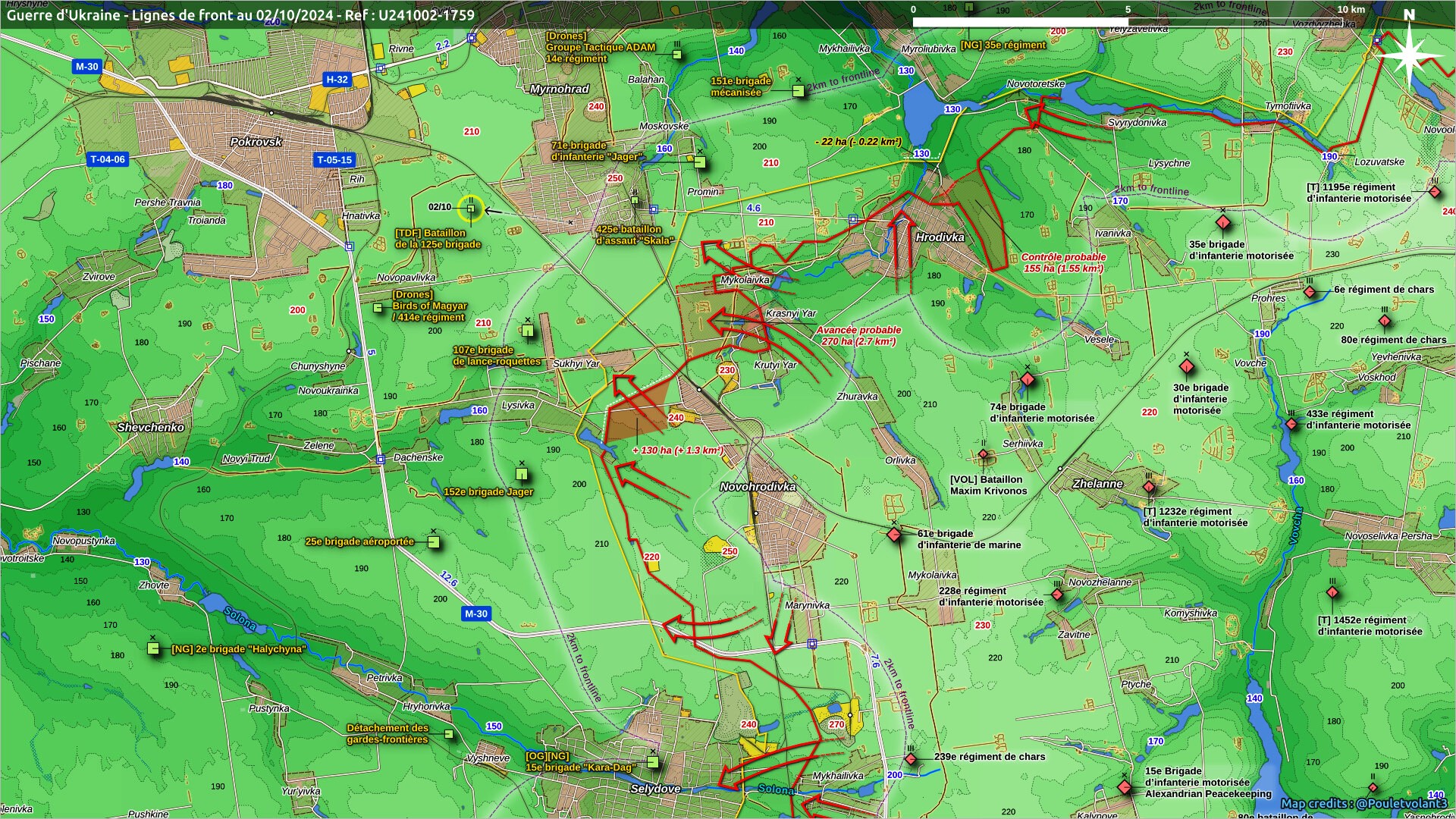 - Geograafiliselt fikseeritud kaadrid ja usaldusväärsed teated näitavad, et Vene väed on taasalustanud pealetungi Kurakhove suunas ja teinud olulisi edusamme. Esiteks kinnitatakse nüüd, et Vene väed on hõivanud Hostre küla ja Selidivski paranduskoloonia ning kaks kirdes asuvat pikka puurida. See edasiminek toimus tõenäoliselt mõnda aega tagasi, kuid see on alles nüüd kinnitatud. Viimasel rünnakul ründasid Vene väed aga teadmata hulga soomukitega mööda raudteeliini. haarates positsioonid tuuletõkkes mõlemal pool rööbasteid. Samuti suutsid nad jõuda Oleksandropili küla lõunaserva. Usaldusväärsed teated viitavad ka sellele, et venelased liikusid oma positsioonidelt tuulemurdudel Ostrivske idapoolsesse elamupiirkonda, kuigi see pole visuaalselt kinnitatud. Ukraina droonioperaatorid vastasid tõenäoliselt Vene tanki ja jalaväe lahingumasina hävitamisega.