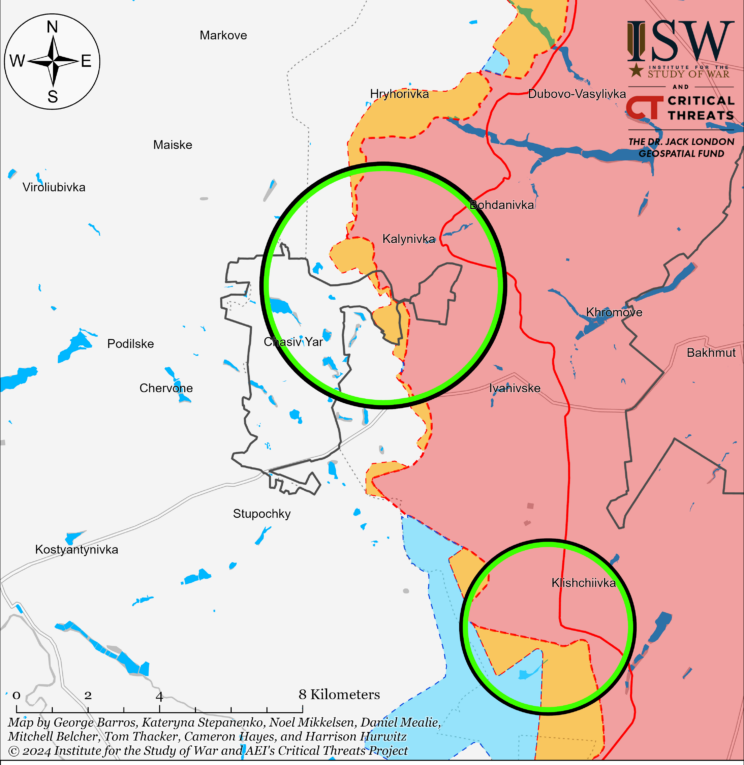Vene väed tungisid hiljuti Toretskis edasi mööda Tsentralna tänavat Toretski kesklinnas. Vene väed jätkasid maapealseid rünnakuid Toretski, Dachne lähedal, Toretskist kirdes ja Toretskist edelas Štšerbynivka lähedal. Vene väed tungisid hiljuti edasi Tsukuryne idaosas (Pokrovskist kagus) ja väidetavalt vallutasid suurema osa Tsukurynest.