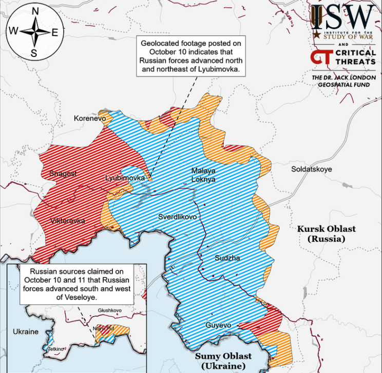 ISW: Vene väed tungisid hiljuti edasi Pokrovski ja Kurakhove lähedale. Vene väed suurendasid 10. oktoobri õhtul jõupingutusi Ukraina vägede väljatõrjumiseks Kurski oblastist.  Alustasid vasturünnakuid Glushkovksy ja Korenevski rajoonis Ukraina vasakul tiival ja Sudžanski rajoonis. Venemaa väejuhatuse eesmärk on tõenäoliselt kiiresti Ukraina väed Kurskist välja tõrjuda, et vabastada lahingujõud oma prioriteetseteks pealetungioperatsioonideks Donetskis ja leevendada Ukraina sissetungi tekitatud kogu teatrit hõlmavat operatsioonisurvet.