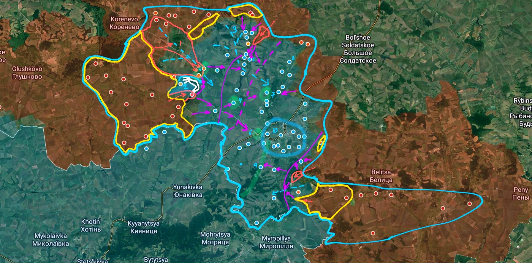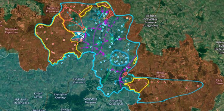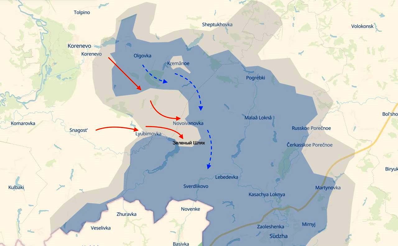 • Mikael Valtersson: RuAF on taasalustanud vasturünnakut Kurski oblastis. Esialgne edu oli märkimisväärne. Küsimus on selles, kas see vasturünnak vabastab Ukraina poolt hõivatud alad? Venemaa edu esimese vasturünnaku ajal on märgitud kollase ja hiljutine edu punasega. Venemaa prognoositavad edusammud lilla ja olulised transpordisõlmed ja -ühendused on roheliselt varjutatud. Maksimaalne Ukraina kontroll on märgitud sinise joonega. Hiljutise pealetungi esmane eesmärk oli kõrvaldada Ukraina loode piirkond. Vene edasitung sundis ukrainlasi lahkuma, sealhulgas Olgovka ja Matveeka asulatest. Mõnede allikate sõnul ei olnud mõnel Ukraina üksusel aega taganeda ja nad on ümber piiratud. Teised väidavad, et nad pääsesid tuletasku kaudu välja, kandes tohutuid kaotusi.Pärast seda, kui Venemaa pealetung põhjas jõudis Zelenõi Šljaki ja Novoivanovkani ning lõunapoolne tõuge Nižni Klinini, olid Liubimovkat ja Tolstyi Lugi kaitsvad Ukraina väed tegelikult ära lõigatud. Lõigatud ala taga on lai veehoidla (valge) ja vaid paarsada meetrit Ukraina kontrolli all veekogust põhja pool. RuAF-i esmane eesmärk on nüüd see tasku likvideerida ja samal ajal jätkata rünnakuid ida suunas, et jõuda keskmisele külaahelale ja põhja poole lähemale. Teistes suundades on Vene väed teinud Sudža põhja- ja kaguosas väikeseid edusamme.Arendades rünnakut põhjas, sunnib RuAF ukrainlasi ülejäänud põhjaosast, sealhulgas kolmest väiksemast asulast, taganema. Kagus püüab Vene pool Plehhovot ümber piirata ja seejärel rindejoone läände nihutada. Teine etapp oleks allesjäänud keskmise külaketi likvideerimine. Eriti oluline on Lebedevka hõivamine, kuna peaaegu kõik põhja poole suunduvad väiksemad teed pärinevad Lebedevkast.Siis lõpuks topeltoperatsioon, et likvideerida või vähemalt pool ülejäänud Ukraina valduses olevast territooriumist. Põhja näpits idapoolse külaketi põhjaosa ära lõikamiseks. Samal ajal püüavad Vene väed lõunas jõuda Sudžast edelas asuvale ristmikule, lõigates sellega ära peamise varustustee tagasi Ukrainasse. Edasi Lõuna-Venemaa vägedel on viimane varustustee läbi lõigata. Väike tee läheb Sudzhast lõunasse, umbes 2 km Melovoist lääne pool. Nende teede läbilõikamisega lõigatakse Ukrainast ära kõik ülejäänud Ukraina väed põhjas. Isegi vahetu ümberpiiramise oht sunniks UkraFi tõenäoliselt taganema ja lahkuma kogu Kurski sissetungilt.