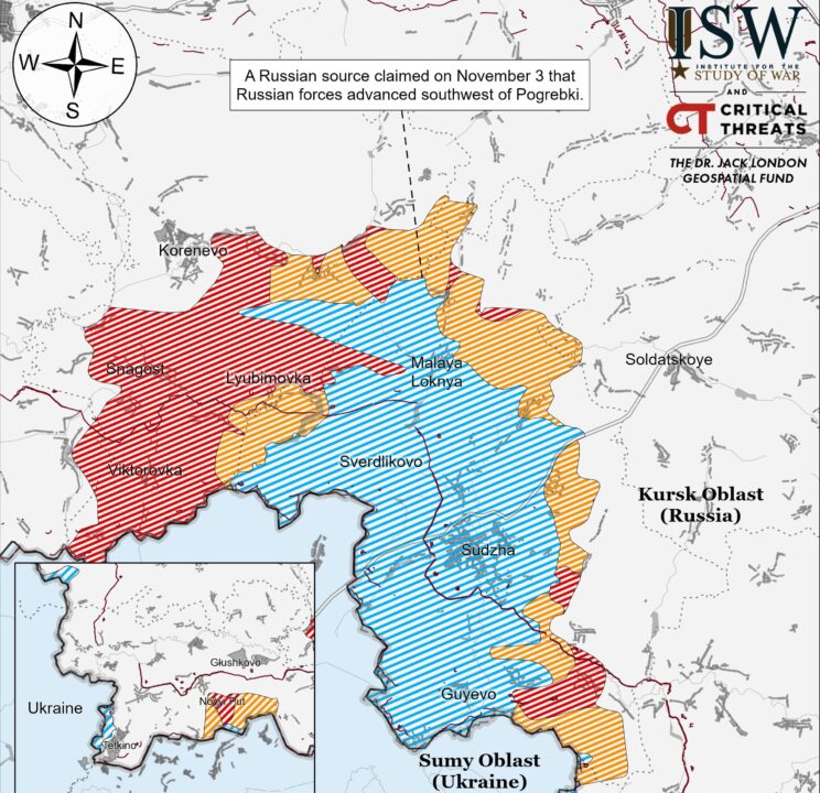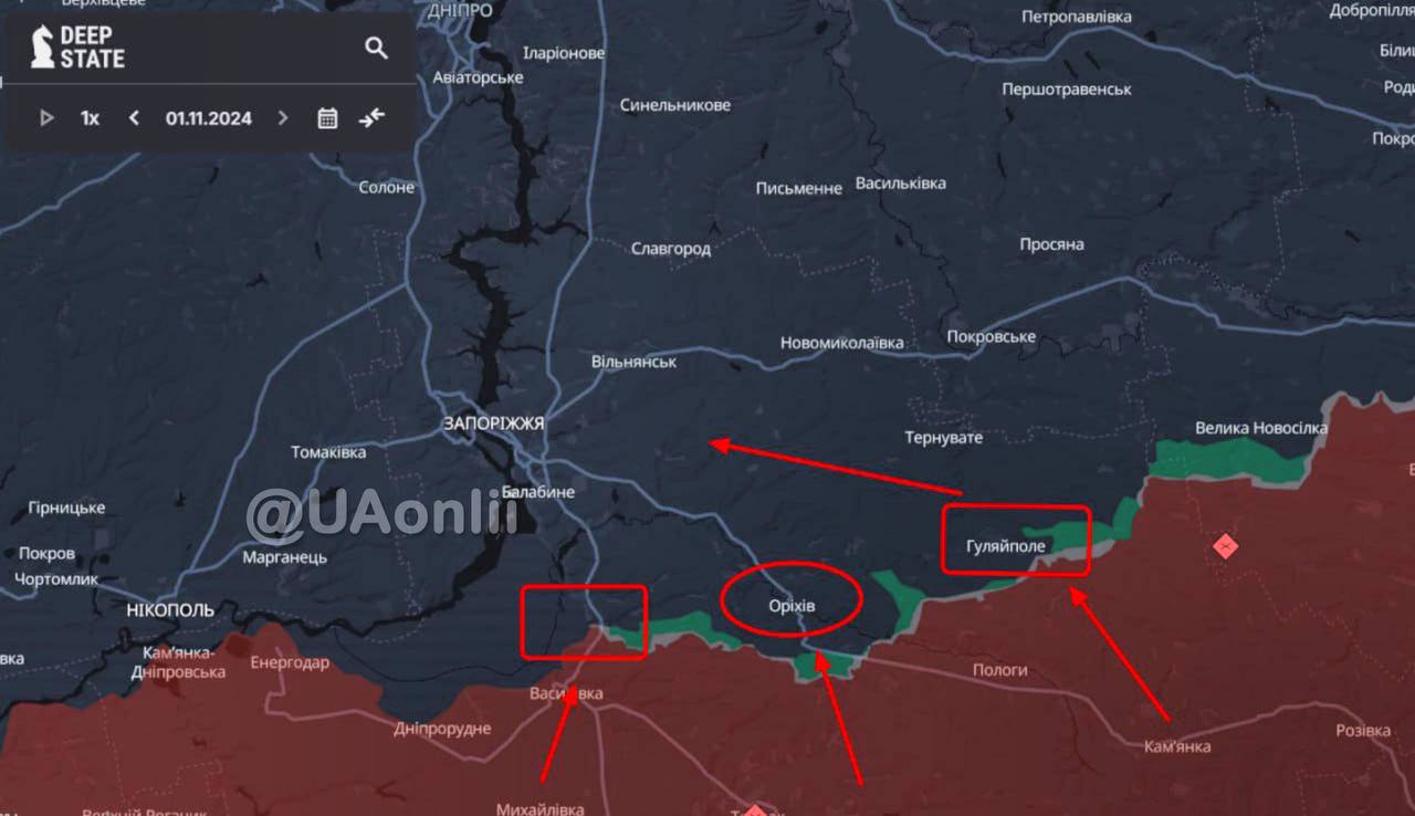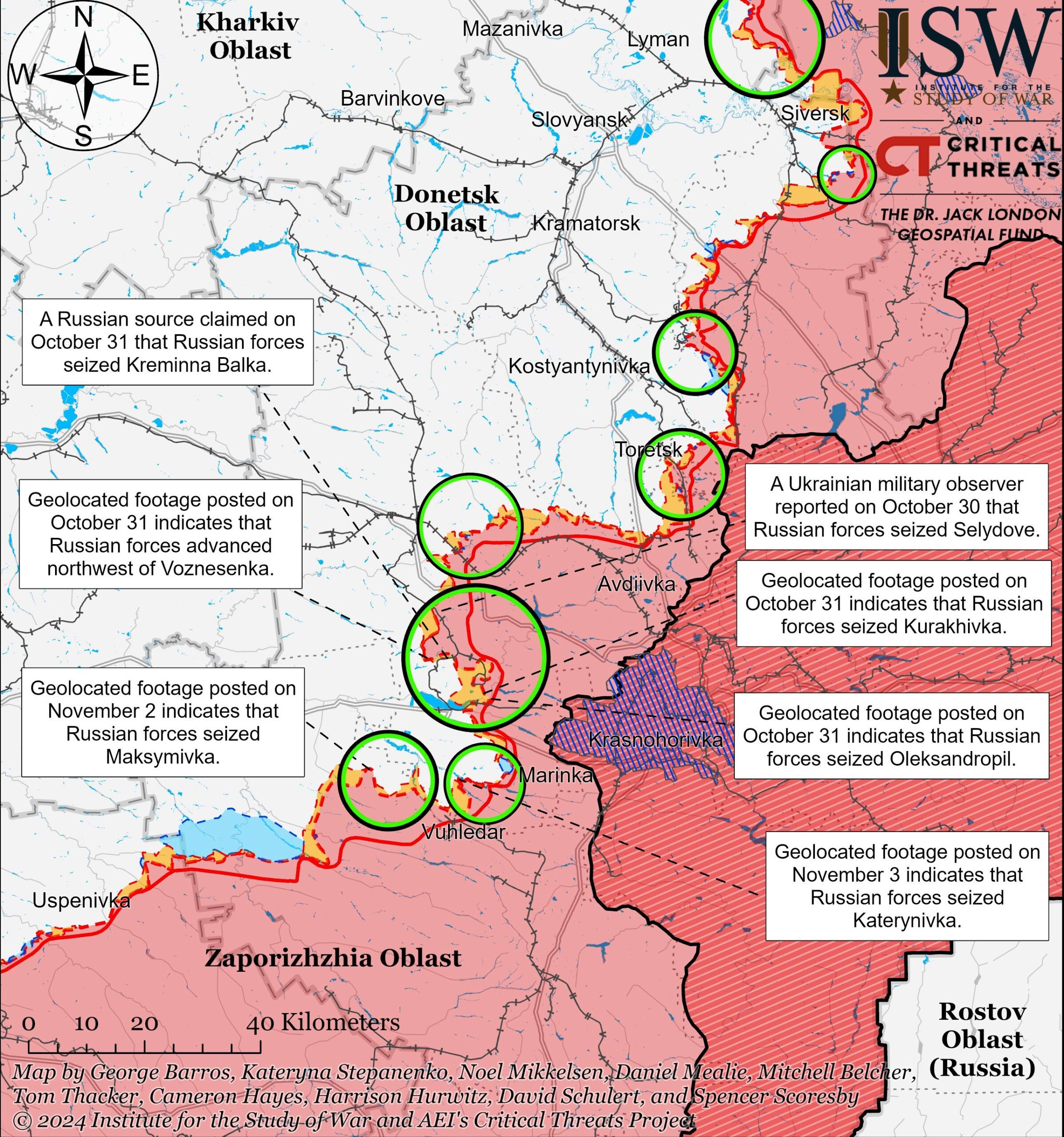 - Ukraina kaart laupäeval, 2. novembril 2024.a.Ukraina 10. mägede rünnakbrigaad näitab täna suurt (piirkonna kohta) Venemaa mehhaniseeritud rünnakut Bahmuti põhjaosas asuva Vyimka suunas koos paljude hävitatud Vene sõidukitegaVenemaa 36. mootorrelvade brigaad heiskab Maksõmivkas lipu, jätkates oma edusamme pärast VuhledaritVene vägesid tulistati Kreminna Balkast läänes, näidates seal väikest venelaste edasitungiPalun lõpetada Põhja-Korea desinformatsioon. Ühtegi Põhja-Korea väge pole seni sõdimas nähtud. Ei mingeid passe ega laipu, lihtsalt lõpetage ära.