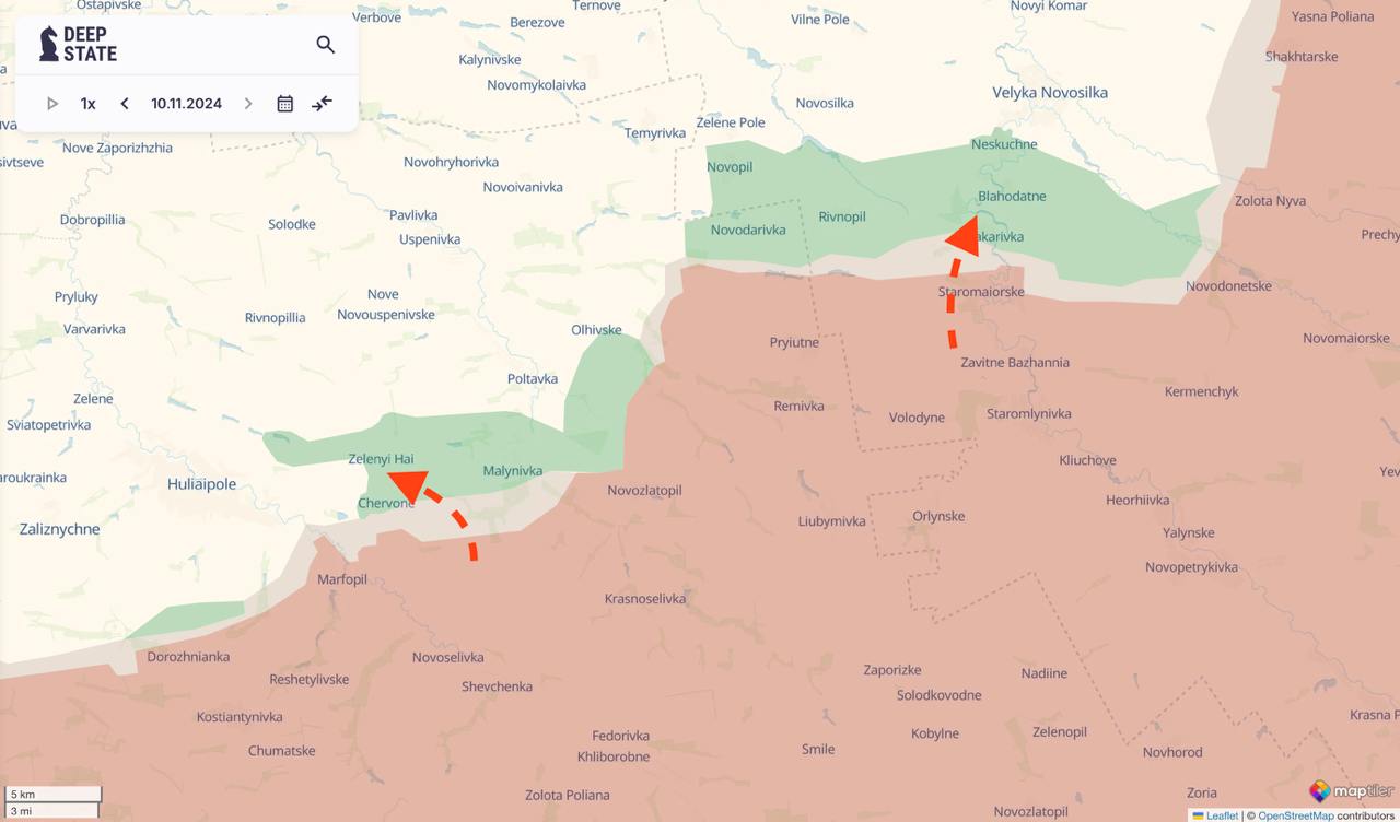 ISW: Ukraina väed tungisid hiljuti Kurski oblastis edasi. Vene väed tungisid hiljuti edasi Kurski oblastis ning Kreminna ja Kurakhove lähistel. Vene väed jätkasid 10. ja 11. Novembril Kurakhove ja Vuhledari piirkondades. Agressor edenes hiljuti Novoselidivka keskossa (Kurakhovest põhja pool), vallutasid Novoselydivka ja tungisid Novooleksiivka lähedale Sontsivkasse (mõlemad Kurakhovest loodes). Vene allikad väitsid, et Vene väed on tunginud Kurakhove idaservadesse ning Stantsiyna ja Kozatska tänavatel käib võitlus, tungisid Maksymivka eeslinnadesse (Vuhledarist loodes) ning Bohoyavlenkast (Vuhledarist põhja pool) põhja ja ida poole. On kinnitamata teateid Vene vägede sisenemisest Jelizavetivkasse.  Vene väed jätkasid rünnakuid Kurakhovest kirdes Novodmõtrivka ja Sontsivka lähedal; Kurakhovest põhja pool Voznesenka, Illinka, Berestki ja Novoselidivka lähedal; Kurakhovest lõuna pool Dalne lähedal; Vuhledarist kirdes Maksymilyanivka, Antonivka ja Katerynivka lähedal; ja Vuhledarist loodes Trudove, Kostjantõnopolske, Uspenivka, Bohoyavlenka ja Maksymivka lähedal.