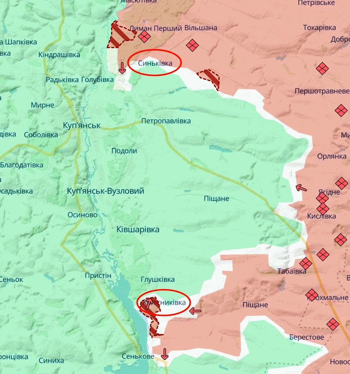 • Geolokatsiooniga kaadrid näitavad, et Vene väed murdsid läbi Ukraina kaitsest Kupjanski suunas ja sisenesid linna idaossa. Pärast mitmeid luureoperatsioone, kus Vene väed ületasid Hnylytsya jõge, näib, et Venemaa leidis Ukraina kaitses nõrga koha ja ründasid soomukitega. Liikusid mööda raudteeliini, mis viib Kupyanski idakaldale. Grupi koosseisu kuulusid tank, BMP ja 2 MT-LBd. MT-LB sai põhjapoolses metsas löögi Ukraina FPV droonilt, kuid tank ja BMP jätkasid liikumist lõuna poole. Väidetavalt hävitati tank ja teine MTLB ning osa isikkoosseisust natuke hiljem. Pimeduse saabudes saatis agressor sinna abiks teise kolonni. Olukord selgitamisel.