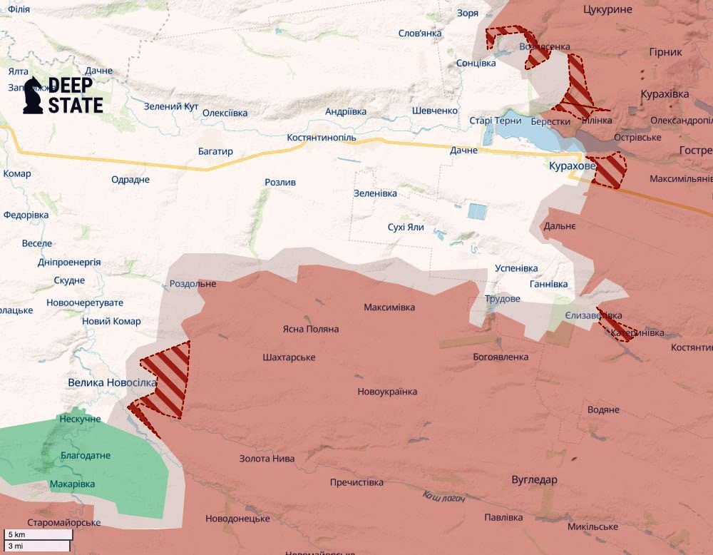 - Deep State: Agressor hõivas 49,9 km² päevas: Vaenlane hõivas Katerynivka ja Jurijivka ning tungis edasi ka Novomlynski, Stelmakhivka, Velika Novosilka, Zhovtoy, Zora, Novodmõtrivka, Voznesenka, Illinka ja Kurakhovo lähedal. Venelased tungisid paatidega Harkivi oblastis Novomlynskist lõuna pool üle Oskili jõe.