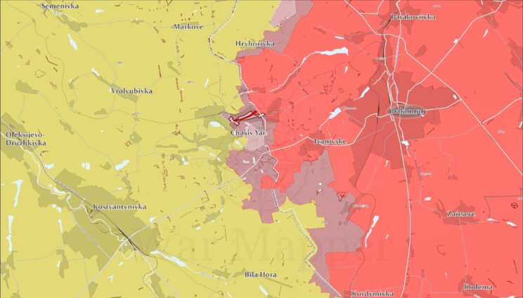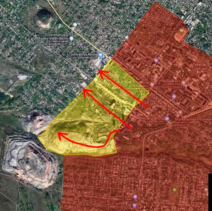 - Geolikatsiooniga kaadrid näitavad, et Vene väed on Toretskis edasi tunginud ja vallutanud linna keskse kaevanduse ning ühe kolmest peamisest terykonist. See rünnak algas jalaväe rünnakuga Ukraina positsioonidele terykonidel. Vene jalavägi suutis ühe sellise Terykoni nõlvadele ronida, vallutades selle. See andis neile põhjapoolsete ukrainlaste ees märkimisväärse eelise. Järgmine samm oli edasitung sügavamale Toretski keskkaevandusse. See oli viimane ukrainlaste tugipunkt linnas ja selle kaguosas oli venelastel juba tugipunkt. Võimendades oma kontrolli kõrvalasuva terykoni üle, õnnestus Vene vägedel hõivata ülejäänud kaevandus ja ka lähedalasuv eraelamupiirkond.