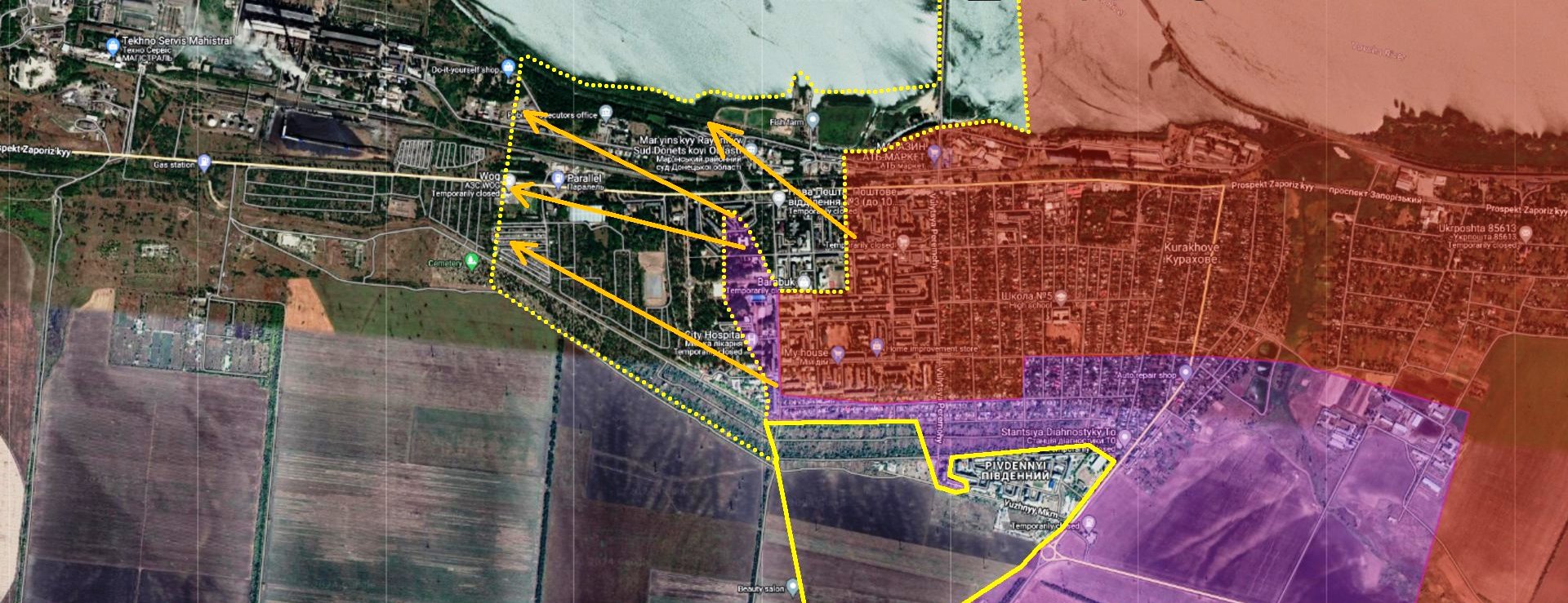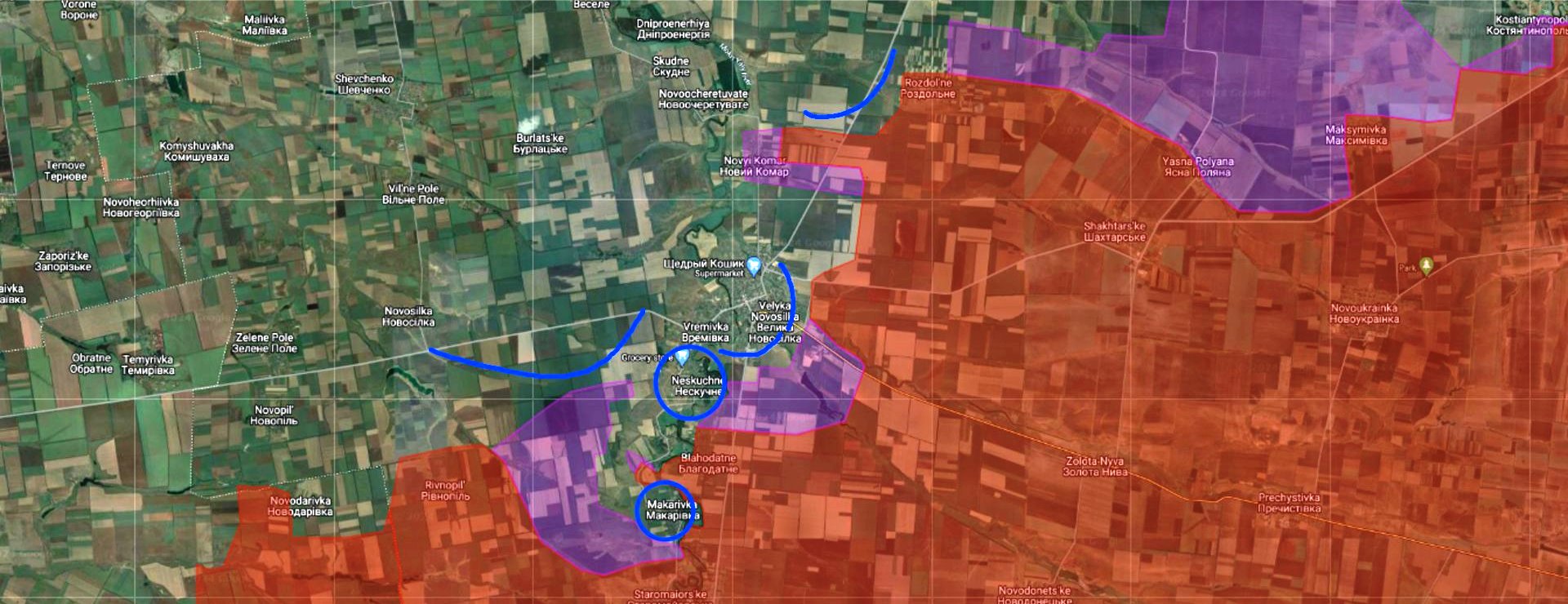 • Olukord Velyka Novosilkas on muutumas Ukraina jaoks kriitiliseks. Sinine on Ukraina peamised kaitsed. Küsimus on selles, et Storoževest lääne pool asuvate venelaste ja viimase linnast välja viiva tee vahel on väga vähe. Lisaks puuduvad Novõi Komarist lõuna pool suuremad kindlustused, mis takistaksid venelaste sisenemist Velyka Novosilka põhjaossa.
