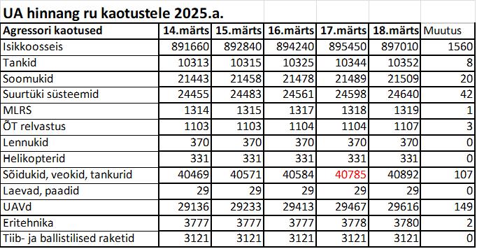 Operatiiv- ja sõjaga seotud info 18. märtsil