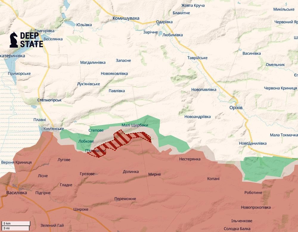 - Deep State: Venemaa on üritanud märtsi algusest läbi murda Pjatikhatka-Maly Shcherbaki liinist. Märtsi alguses alustas 108. Vene jalaväerügement pärast täiendust rünnakuoperatsioone kaitseväe positsioonidele Maly Shcherbaky piirkonnas, kuid meie seal paikneva üksuse halva koordinatsiooni tõttu oli raske aru saada, kuhu ja kui kaugele vaenlane oli edasi jõudnud. Veidi hiljem sai teatavaks sama 108. Vene jalaväerügemendi rünnak Pjatikhatkyl, kus kaadrid jäädvustasid selle küla kagupoolse ääreala lagedaid. Viimastel päevadel pole rünnak Pjatikhatkile peatunud ja vaenlane püüab nad täielikult kontrolli alla võtta. Lahingud jätkuvad. Vaenlast märgati ka Stepovoye piirkonnas, kus ta üritab välja pääseda ja kiirteel kanda kinnitada. Seni on suurtükiväe ja muude tulevahenditega õnnestunud okupante ohjeldada, kuid vaenlane on kiirteele lähenenud. Väikeste jalaväerühmade rünnakud jätkuvad ka Maly Shcherbakyle, kuid sealne olukord on selgitamisel. Teadaolevalt oli vaenlane külast lõuna pool edukas ja on istandustes maad võtmas. Võitlus jätkub. Kahjuks on meie üksustel traditsioonilised probleemid. Sõjaväe juhtkond on olukorrast teadlik ja rakendab stabiliseerimismeetmeid. Suured lootused on 128. OGShBr-l, kuna tegemist on nende piirkondade kogenuima brigaadiga, aga ka teiste selles suunas tööd tegevate üksuste ja allüksuste meeskondadega.