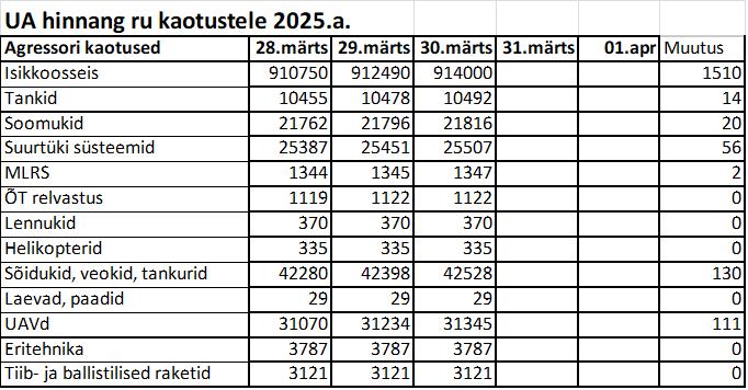 Iraani ametnik lisas, et lisaks Diego Garcia ründamisele, ähvardatakse rünnata ka Türgit ja riike, kus asuvad USA baasid Lähis-Idas, öeldes: “Briti või Ameerika vägede sihikule seadmisel ei tehta vahet, kui Iraani rünnatakse piirkonna mis tahes baasist. Kui saabub aeg, pole vahet kas ameeriklaste poolt kasutatakse türgi vm riigi baasi .” - Ukraina relvajõudude ülemjuhataja Oleksandr Syrskyi ütles 29. märtsil, et Vene armee kaotused autotööstuses ja eritehnikas on 2025. aasta algusest ulatunud ligi 10 tuhande ühikuni. Syrskyi sõnul neutraliseerivad kaitseväelased iga päev üle tuhande Vene sõjaväelase ja hävitavad sadu üksuseid vaenlase tehnikat. Ainuüksi aasta algusest on Vene vägede kogukahjud autotööstuses ja erivarustuses jõudnud 9838 ühikuni …