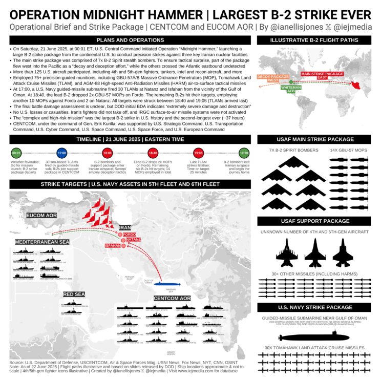 - Ameerika B-2 pommitajad tabasid märkamatult sügavat Iraani sisemust. Mitte ühtegi radarisignaali, mitte ühtegi hävitaja vastust ega ühtegi lasku. Ühendvägede Ülemjuhataja Caine nimetas seda veatuks: „Ükski teine sõjavägi maailmas poleks seda suutnud.“ Peibutuspommitajad lendasid läände, samal ajal kui pärispommitajad läksid itta, säilitades täieliku üllatusvõime.