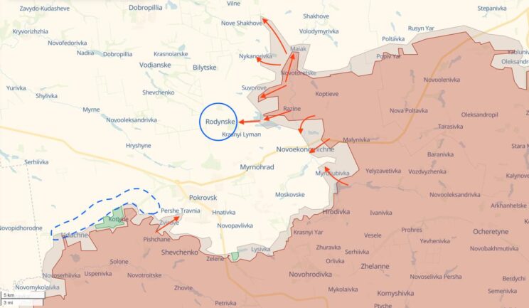 - Pokrovski olukord on tõsiselt keeruline. Venemaa sõjavägi ründab aktiivselt linnast ida ja kirde pool asuvaid piirkondi – DeepState’i analüütikud on need piirkonnad tuvastanud. Nad ei pääsenud kiiresti läände, seega liiguvad nad põhja poole – see on tavaline taktika. Lisaks on käimas ohtlikud rünnakud läänest – Zverevo küla lähedalt. Just sealt murdis linna väike sabotööride rühm, kes tulistas Ukraina sõdurite pikapi pihta. Nad teatavad, et osa rühmitusest on juba hävitatud, teisi otsitakse. Rodinskoje jääb kaitse võtmeelemendiks. Kui Vene väed selle vallutavad, on suur tõenäosus Pokrovsk põhjast sisse piirata. Niikaua kui Ukraina relvajõud seda piirkonda hoiavad, suudab linn vastu pidada, kuid veelgi põhja poole möödasõitmiseks kulub palju rohkem aega. Kotlinost põhja pool asuv ala (punktiirjoon) on samuti oluline. Selle kaitsmine ei võimalda läbimurret läbi põldude Pokrovski varustusteele.