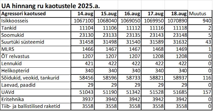Operatiiv- ja sõjaga seotud info 18. augustil