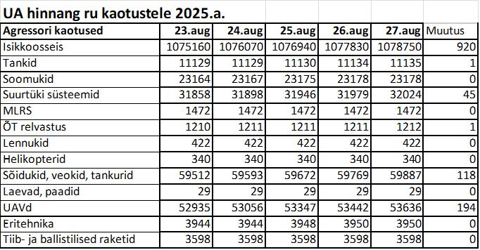 Operatiiv- ja sõjaga seotud info 27. augustil