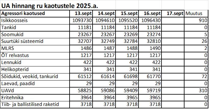 Operatiiv- ja sõjaga seotud info 16. septembril