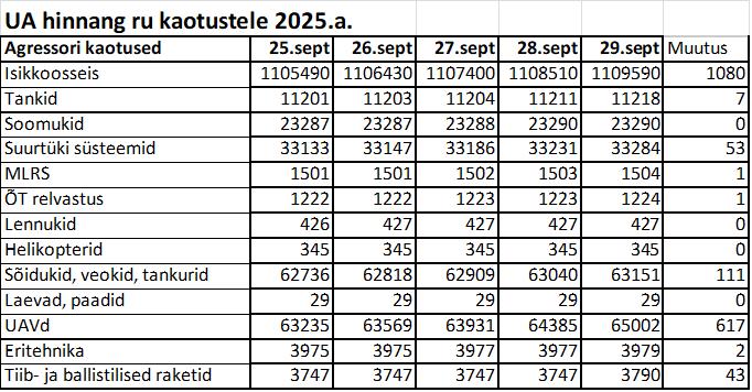 Operatiiv- ja sõjaga seotud info 29. septembril