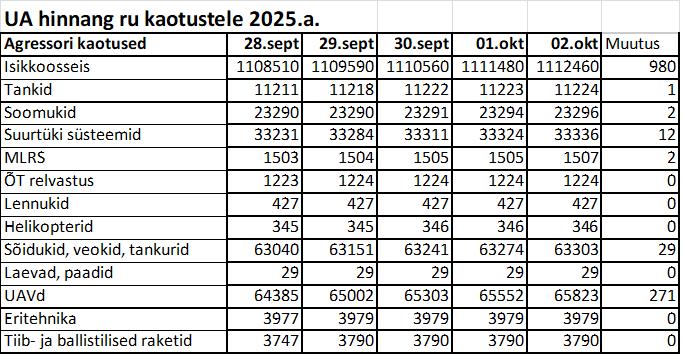 Operatiiv- ja sõjaga seotud info 02. oktoobril
