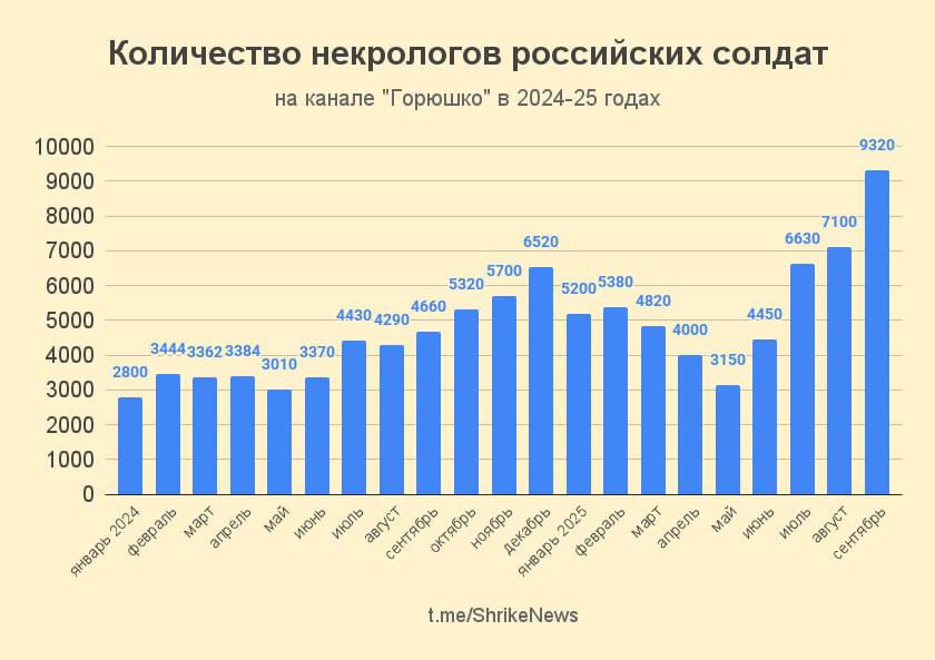 - Projekt “Gorjuško”, mis tuvastab ja loeb venelaste kaotusi avalikult kättesaadavate nekroloogide põhjal, loendas septembris 9320 kinnitatud ja tuvastatud moskvalast – see on absoluutne rekord. Ja siin loetakse ainult venelasi – igasugused rüselus- ja Donbassi kaevurid pole nimekirjas.