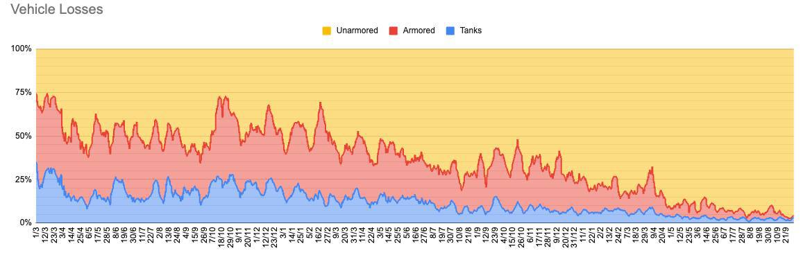 - Soomusmasinate arv, mida moskvalased praegu rindel kasutavad, moodustab alla 10% sõidukite koguarvust. Sellest üle 90% moodustab soomustamata varustus – mitmesugused “pätsid”, mootorrattad, golfikärud jne. Soomusmasinate arvu vähenemise trend rindel jätkub.