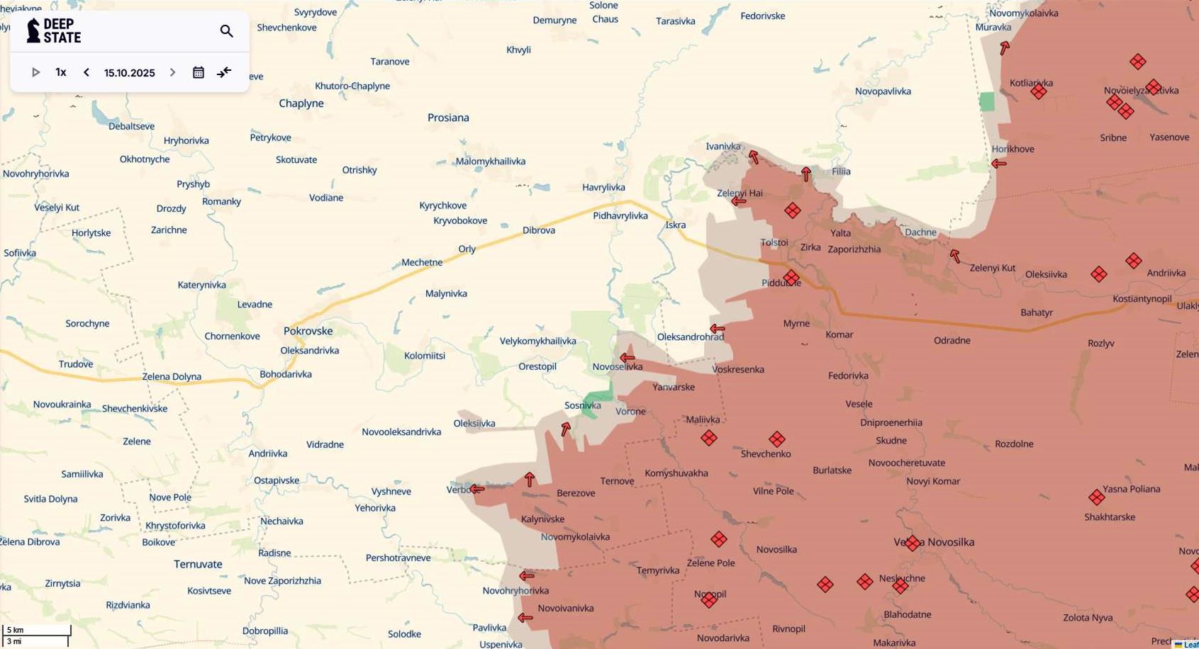 Ukraina 15. Oktoobril, 2025. Kiievis ja teistes oblastites toimub Ukrenergo korraldusel ulatuslik elektrikatkestus remonditöödeks pärast Venemaa rünnakuid. Vene väed heiskavad lipu Novopavlivkas, Pokrovskist lõunas. Vene väed tungivad Oleksijivkasse Dnipropetrovski oblastis ja heiskavad lipu ning liiguvad ootuspäraselt ka veidi lõuna poole mööda Jantšuri jõe kallast. Neile, kes Sumõ suunast vaimustuses on, on need vaid mõned külad. Olulised on need ainult venelaste tapmispaigana.