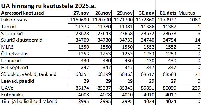 Operatiiv- ja sõjaga seotud info 01. detsembril
