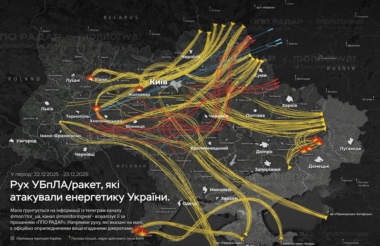 Ukraina, 23. Detsembril, 2025.a. Eile registreeriti Venemaa mehhaniseeritud rünnak Kostjantõnivka suunas, mida tabasid tugevalt 28. ja 100. mehhaniseeritud polku (ja teised) Ivanopillja lähedal. Huljaipole suund on endiselt nõrk, Vene väed suruvad siia jalgsi tugevalt peale. Samuti näidati detsembri alguses toimunud Venemaa lipu heiskamist Andriivka alevikus Pokrovske suunas. Stavropoli krai lähedal asuvat Budjannovski keemiatehast tabasid eile õhtul Ukraina droonid, põhjustades suure tulekahju.