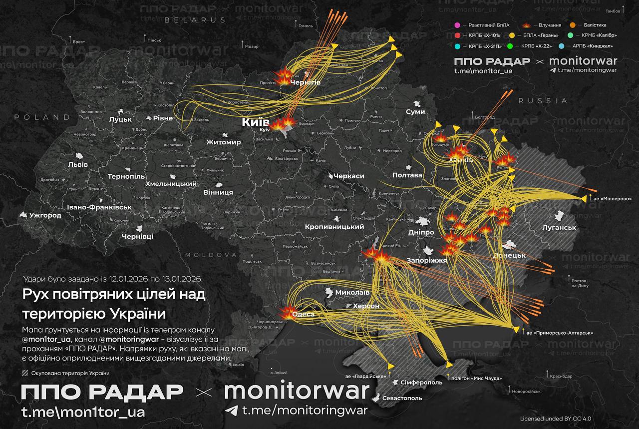 Vene väed liikusid hiljuti edasi Borova lähedal, Kostjantõnivka-Družkivka taktikalises piirkonnas ja Lääne-Zaporižžja oblastis. Ukraina väed jätkasid oma pikamaarünnakukampaaniat Venemaa kaitsetööstuse ja energiavarade vastu. Vene väed viisid 12. jaanuari öösel läbi Ukraina vastu rea raketi- ja droonirünnakuid, mis kahjustasid oluliselt energiainfrastruktuuri kogu Ukrainas ja tabasid Harkivi oblastis asuvat postiterminali.