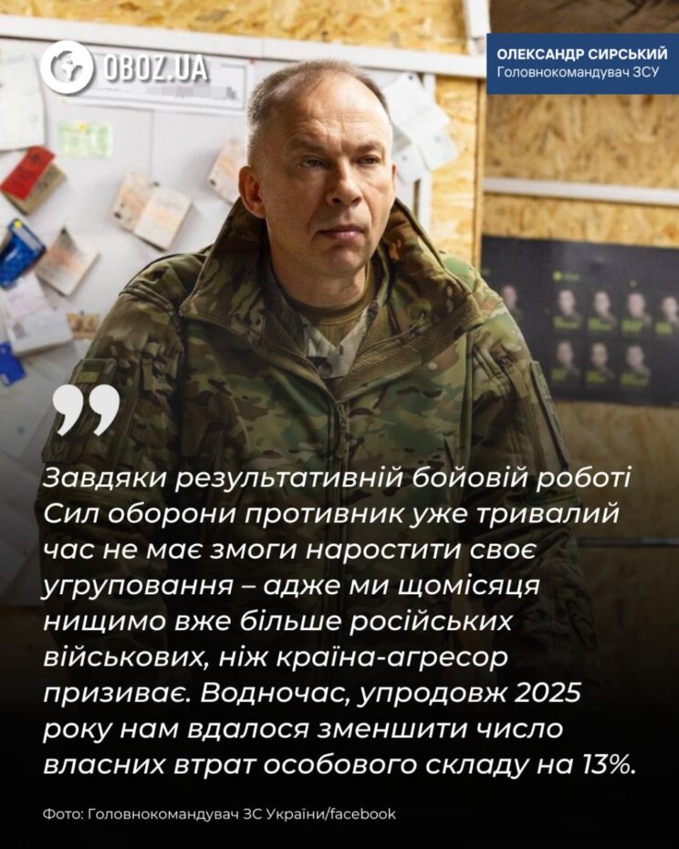 - Sõrski: Me jäime ellu. Sest meie sõdurid töötasid täie pühendumusega ja võimete piiril, tekitades okupantidele maksimaalseid kaotusi ning vähendades vaenlase armeed 2025. aastal enam kui 418 tuhande hukkunu ja haavatu võrra. Eelmisel aastal vähenesid Ukraina relvajõudude isikkoosseisu kaotused 13%. Vaatamata sellele sai 2025. aasta Ukraina armee jaoks tõsiseks proovikiviks. Ukraina relvajõudude ülemjuhataja sõnul ei lubanud kaitsevägi okupantide pingutustest hoolimata okupantidel kriitilisi läbimurdeid teha. Lisaks suutsid kaitsjad hoida strateegilisi positsioone ja luua aluse edasisteks tegevusteks. „See aasta on tõestanud: oleme võimelised vaenlast süstemaatiliselt kurnama ja tema potentsiaali oluliselt vähendama. Kaitsevägi ei lubanud agressoril oma plaane ellu viia, säilitas strateegilised positsioonid ja valmistas ette aluse edasisteks tegevusteks,“ märkis Sõrski.