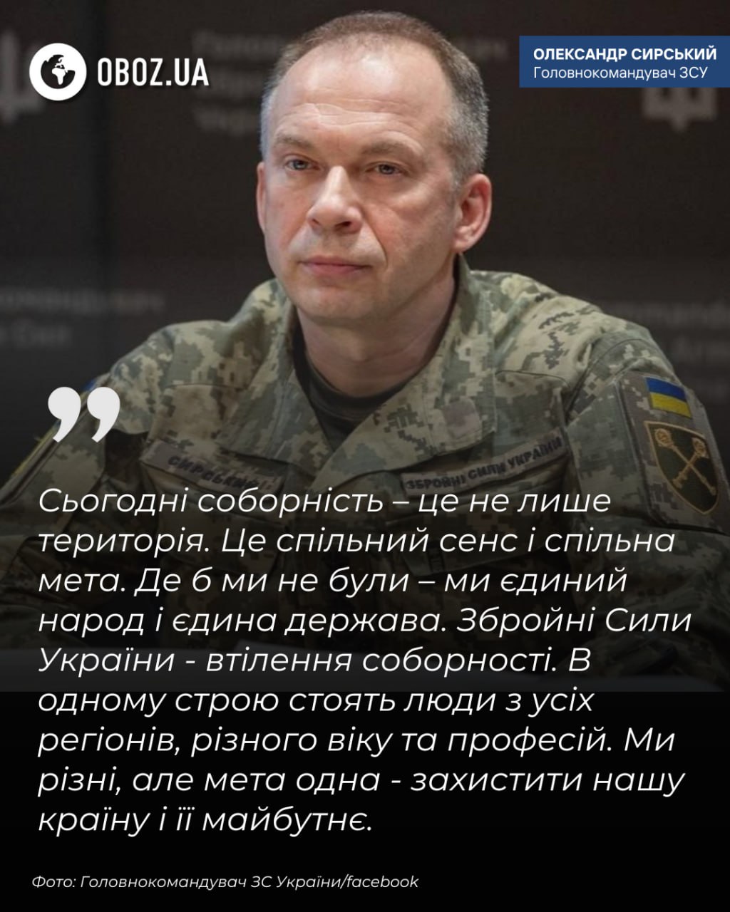- Sõrski õnnitles ukrainlasi ühtsuspäeva puhul ja tänas kaitsjaid. Täna ei ole ühtsus ainult territoorium. See on ühine tähendus ja ühine eesmärk. Kus iganes me ka poleks, oleme üks rahvas ja üks riik. Ukraina relvajõud on ühtsuse kehastus. Inimesed kõikidest piirkondadest, eri vanuses ja elukutsega seisavad ühes formatsioonis. Me oleme erinevad, aga eesmärk on üks – kaitsta oma riiki ja selle tulevikku. Ukraina relvajõudude ülemjuhataja rõhutas, et sajandeid on vaenlased püüdnud meie riiki lõhestada ja hävitada, kuid Ukraina on jäänud kindlaks. Ukrainlased tõestasid taas oma vastupidavust, kui Venemaa diktaator Putin tahtis meilt iseseisvuse ära võtta.