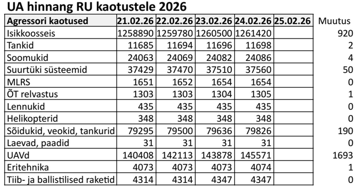 Peastaabi Operatiivinfo seisuga 24.02.2026 kell 08.00