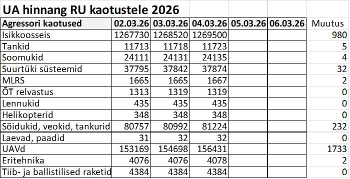 - Zelenskõi: Venelastel on suur personaliprobleem. Nad muutuvad nõrgemaks. See on meie jaoks uus tunne – ja see pole halb. Vaenlase personalikaotused hakkavad kuhjuma. „Me tunnetame Venemaa nõrkust teatud valdkondades. See on uus tunne. See ei tähenda, et peaksime valvsust langetama, lubage mul selgitada. Me ei saa lõõgastuda, ei saa arvata, et vaenlane on alla andnud, ei saa arvata, et nende arv on vähenenud. Aga oluline, väga oluline on see, et personali osas tunnevad nad end veidi nõrgemana. Seal pole aega väljaõppeks. Seega on neil meie arvates suur personaliprobleem. Muidugi on kõik meie personaliprobleemid teada, meil pole saladusi. Meil on, noh, need probleemid, need on olemas. Aga ikkagi teeme kõik, et oma mehi, oma armeed tugevdada. Aga see tunne, see pole halb. Ma arvan, et igakuised kaotuste arvud hakkavad mõju avaldama. Jällegi, ma ei taha kõlada nagu mingi pseudooptimist, aga ma lihtsalt ütlen, et minu arvates hakkavad vaenlase personalikaotused kuhjuma. Seda ma mõtlengi. Seega näeme, kuidas asjad edaspidi lähevad,“ – Zelenskõi, teisipäeval, 3. märtsil 2026.