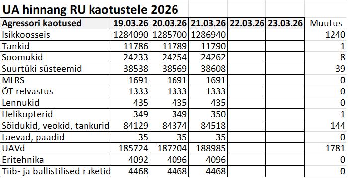ZELENSKÕI: Ukraina armee peatas Venemaa Armee märtsipealetungi, tekitades Venemaa poolele suuri kaotusi. „Meie poisid on lihtsalt hämmastavad. Nad peatasid venelaste kavandatud pealetungi – see on fakt. Pealetung pidi toimuma varakevadel, märtsis. Nad ebaõnnestusid. Nad pingutasid kõvasti. Meie poisid peatasid nad. Lihtsalt suurepärased! Iga päev näitavad meie sõdurid oma kangelaslikkust. Näiteks täna tulistas 59. brigaad alla vaenlase Ka-52 helikopteri. Ja iga päev kannab vaenlane tõsiseid kaotusi. Vaenlane ei lõpeta Ukraina maa vallutamist. Seega peame kindlaks jääma. Ja me kõik peame oma kangelasi aitama ja olema tänulikud.“
